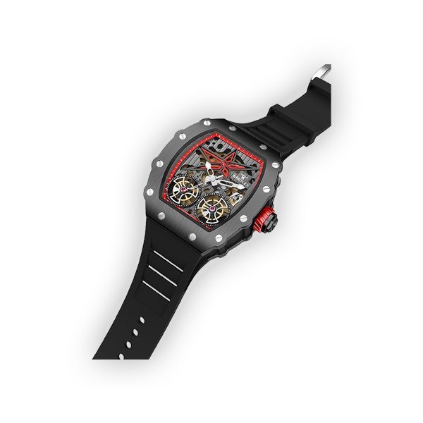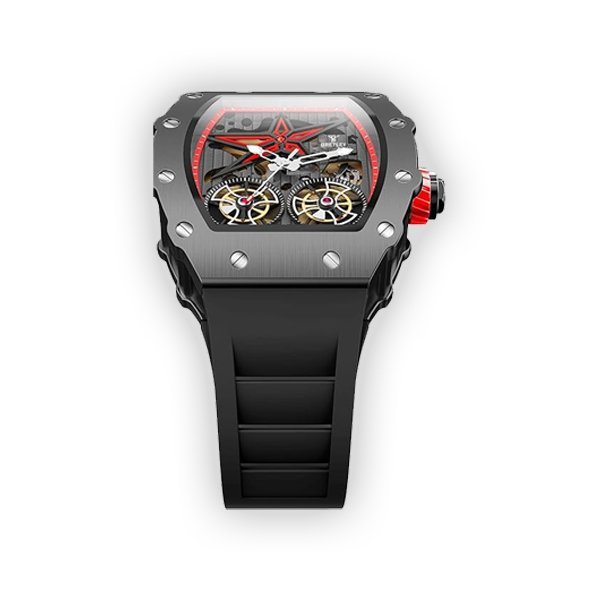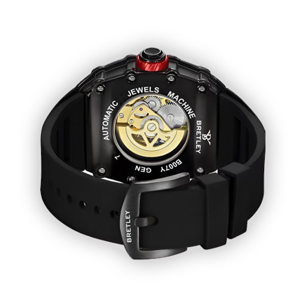 The Bretley B007Y Skeleton Red watch features a 40 mm tonneau case with a skeleton dial, revealing its automatic mechanical movement. Its striking red and black design adds a bold touch to the aesthetic.
