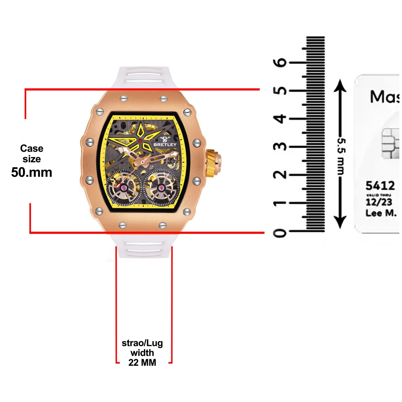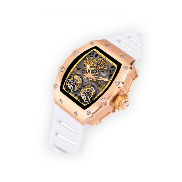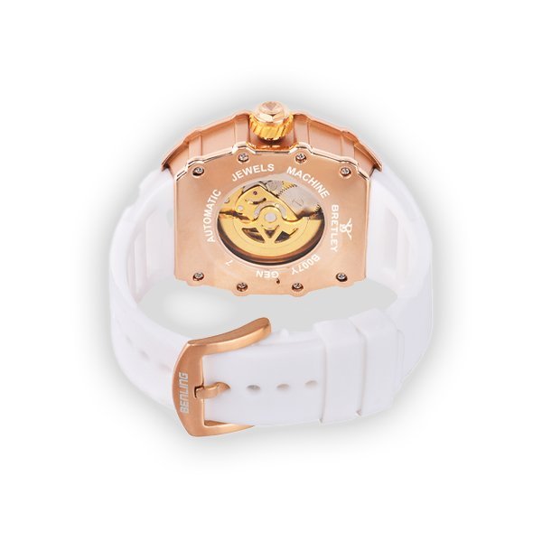 The Bretley B007Y Skeleton Watch features a 40 mm tonneau case with a skeleton dial, revealing its automatic mechanical movement. Its sleek design combines modern aesthetics with traditional craftsmanship.