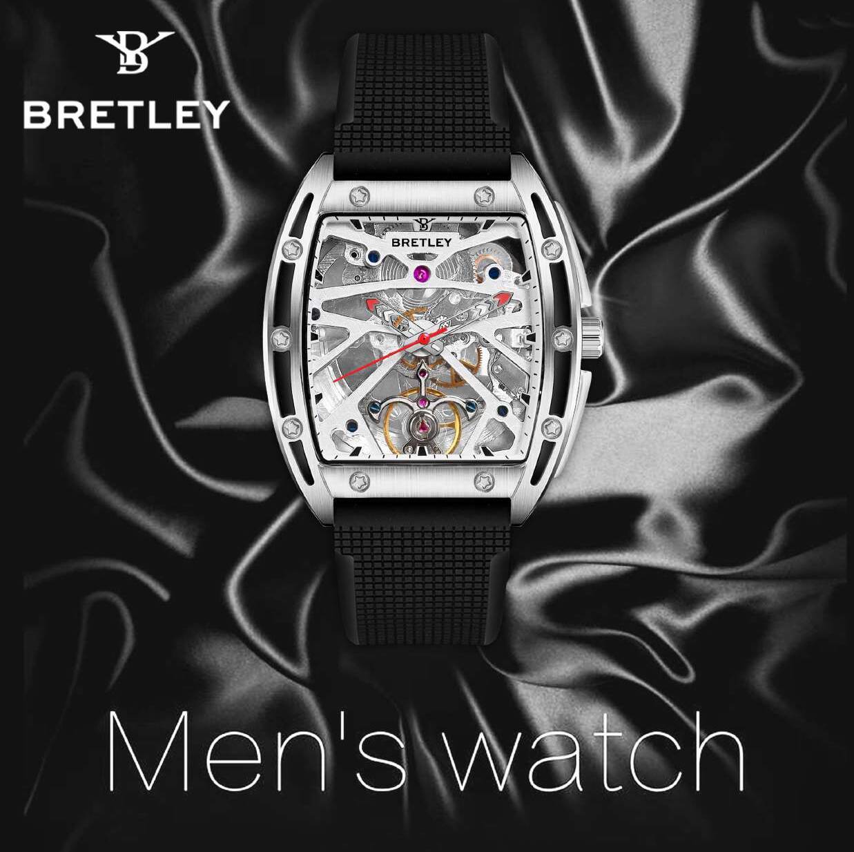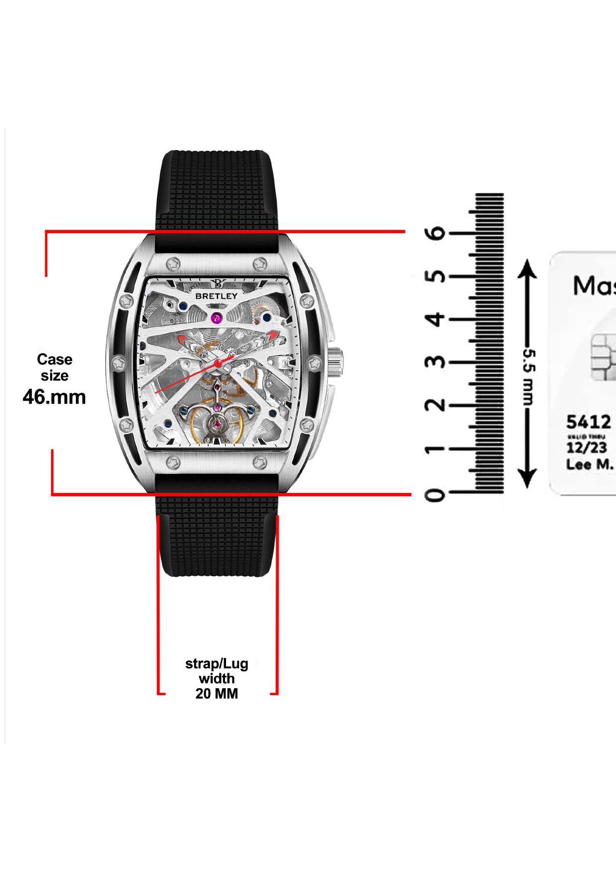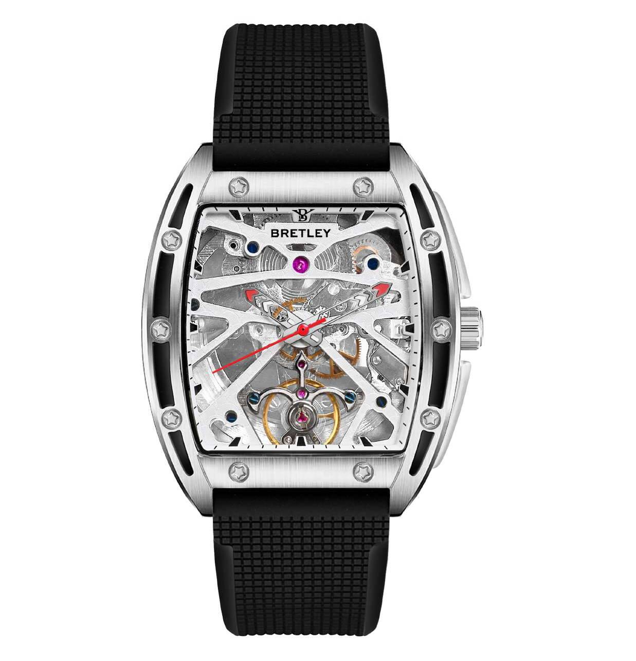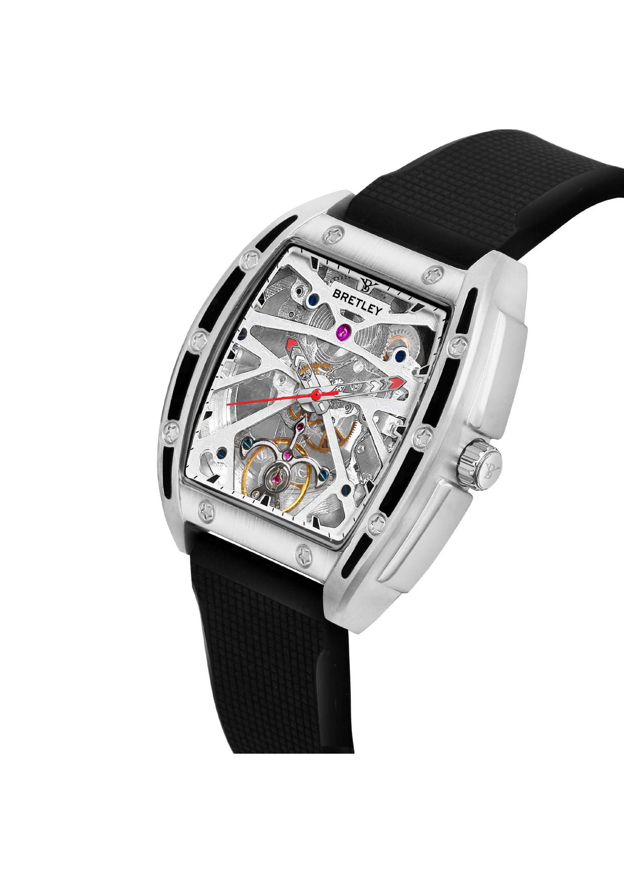The Bretley Silver Skeleton Automatic Watch features a 46 mm silver-tone tonneau case with a skeleton dial showcasing automatic movement.