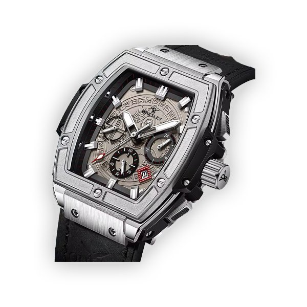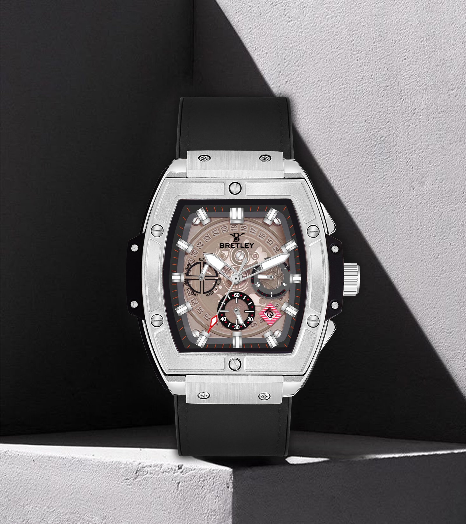 The Bretley B6789Y Bold Mechanical Watch features a 46 mm tonneau case with a bronze skeleton dial, revealing its automatic mechanical movement. Its bold design combines rugged aesthetics with refined craftsmanship.